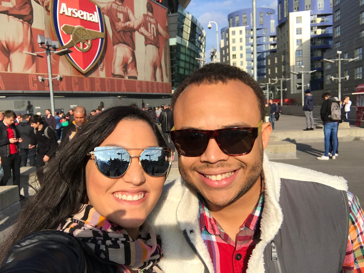 On our first trip together in 2017, as a young, unmarried couple, we went to London. We planned the entire trip around an Arsenal match. I will never forget the look on his face the first time he saw the Emirates Stadium, or the look on his face surrounded by his people, chanting and singing. The joy he felt watching his team beat Manchester United 2–0.